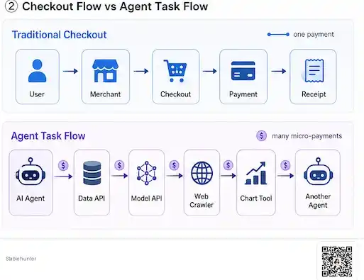 如果交易对象是一个传统商户,Agent 当然可以进入现有 checkout flow,用信用卡、借记卡、虚拟卡或者钱包完成支付。但如果交易对象不是一个商户,而是一个 API、一个模型、一个数据接口、一个内容资源,甚至另一个 Agent,问题就变了。