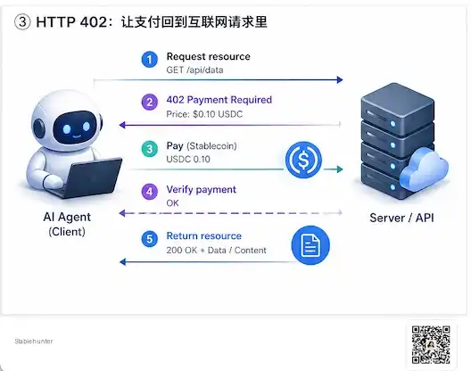 Agent 请求一个资源。服务方返回 402 Payment Required。Agent 判断价格和授权。Agent 支付稳定币。服务方验证后释放资源。