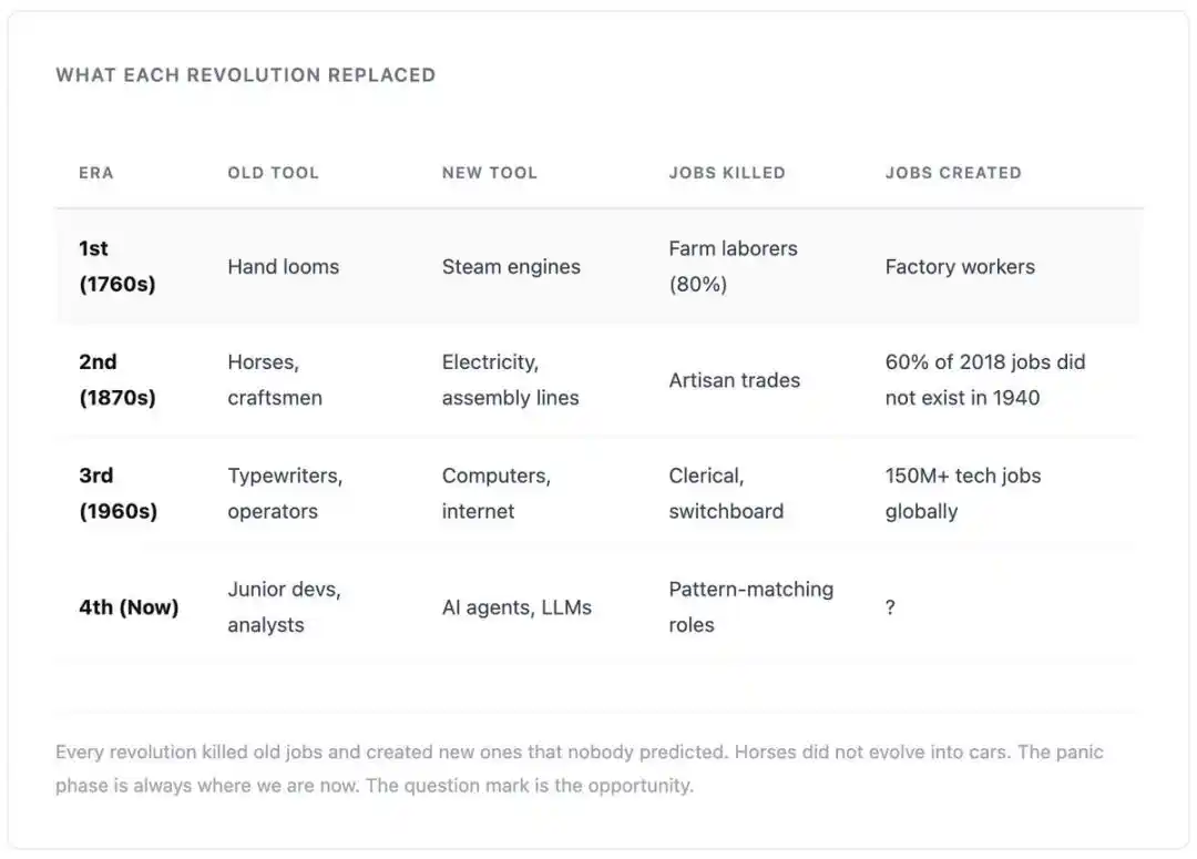 - New tools create new professions. In 1995, no one foresaw 'social media manager.' In 2005, no one foresaw 'cloud architect.' Today, no one can predict the AI-native professions of 2030. But every industrial revolution has created more jobs than it destroyed, without exception.