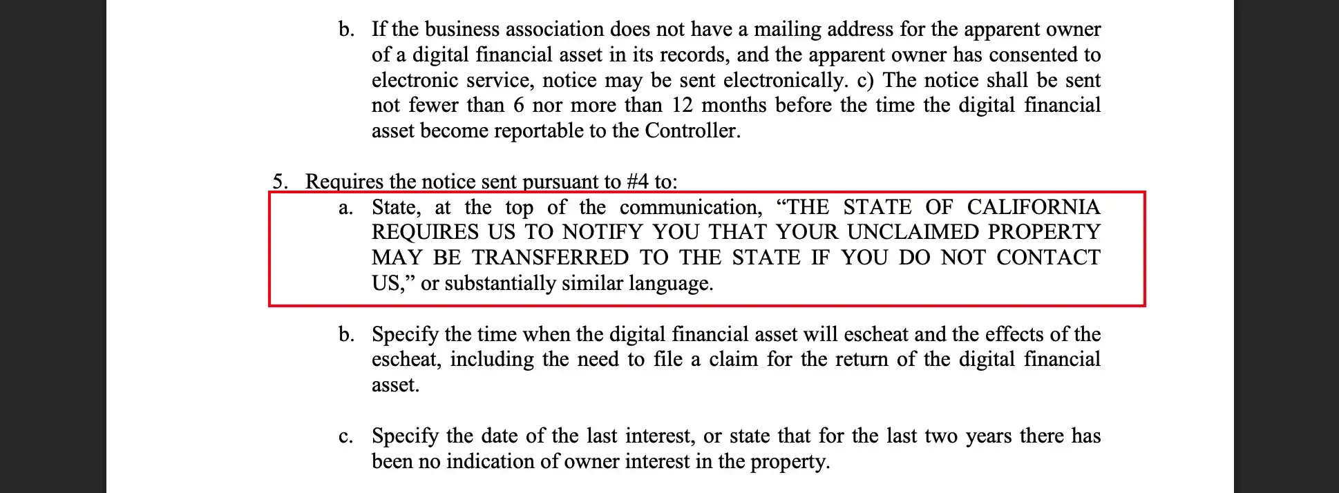 As per the regulations, the exchange, as the holder of the assets, must send a notice to the user 6 to 12 months before reporting the assets to the state government. This notice is not a routine user agreement update; its format has strict legal requirements. The top of the notice must be clearly marked in bold: "The State of California requires us to notify you that your unclaimed property may be transferred to the state if you do not contact us".