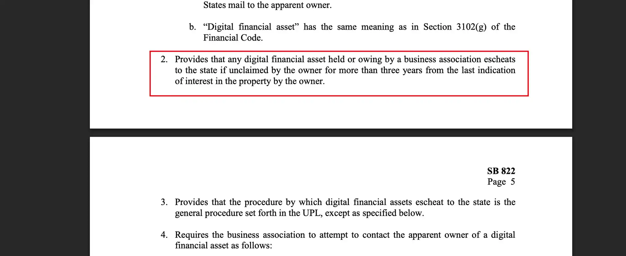 According to the provisions of SB 822, if a digital asset account shows no "indication of owner interest" for a period of three years, and communications sent by the exchange are returned or undeliverable, the asset will be deemed "unclaimed" and trigger the escheatment process.
