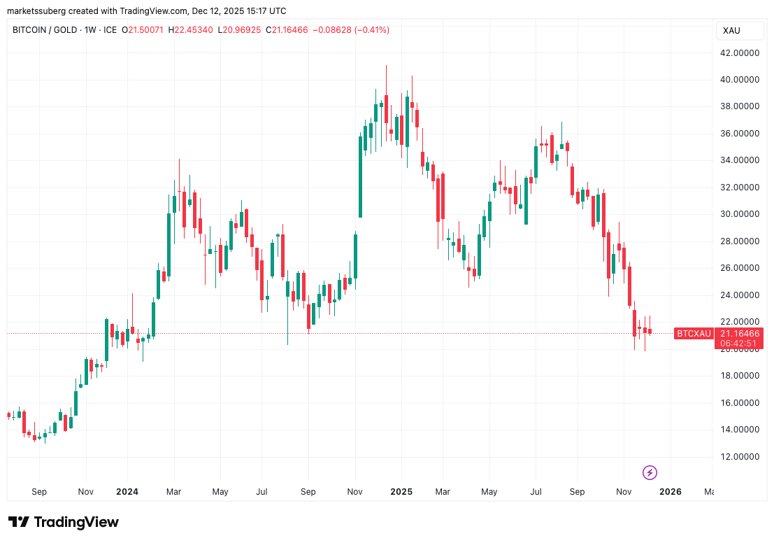 At the December monthly open, Bitcoin reached its lowest levels against gold since early 2024.