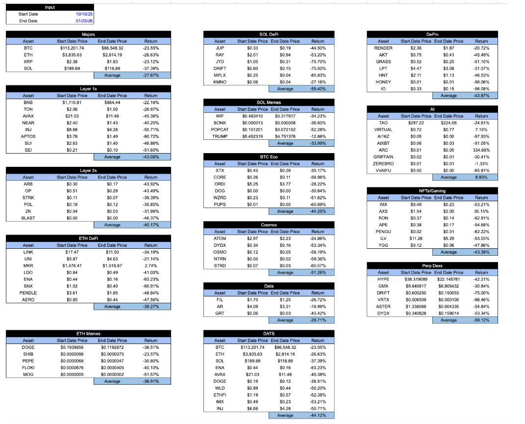 Fast forward to today, and the returns of all "crypto-wrapped" assets look identical. Since the flash crash on October 10th, the declines across sectors are almost indistinguishable. No matter what you hold, or how the token captures economic value, or what the project's trajectory is... the returns are largely the same. This is very frustrating.