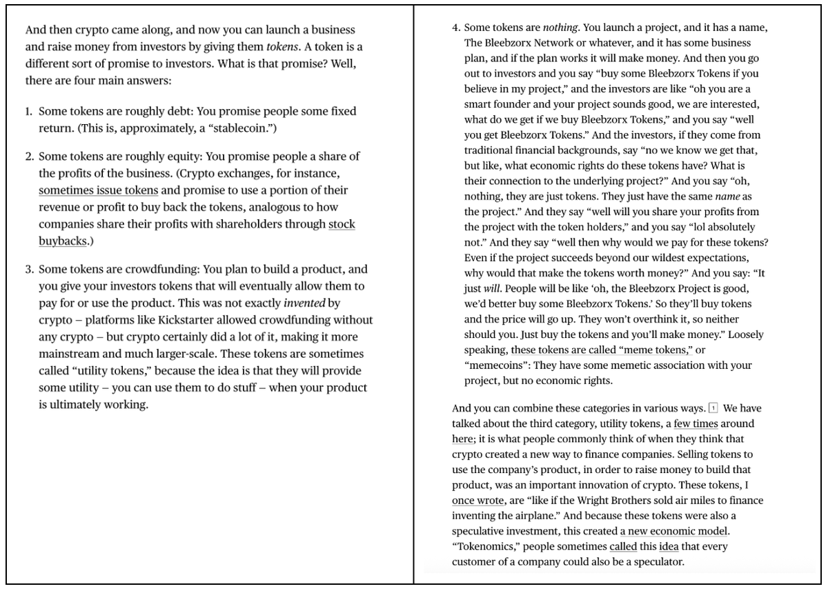 This is why Matt Levine's recent article about tokens was so surprising and well-received. In just 4 short paragraphs, Levine accurately described the differences and nuances between various tokens. It gives me some hope that this kind of analysis is still possible.