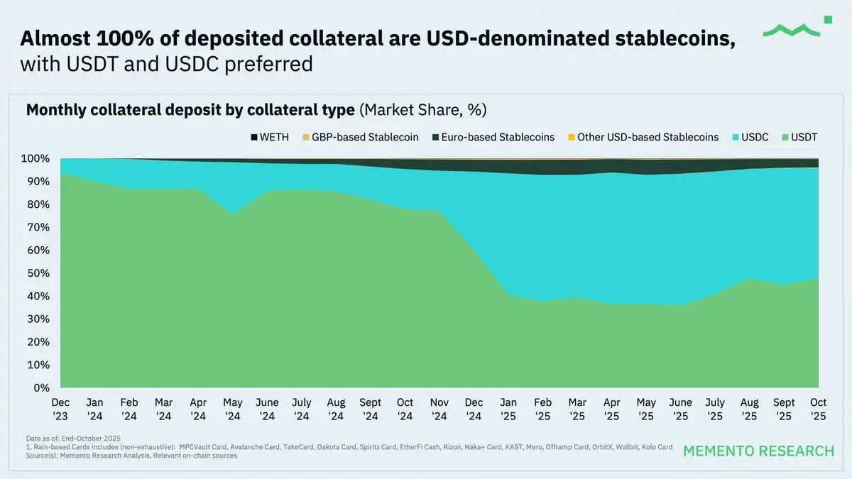 • Deposits Dominate Spending: Stablecoins dominated deposit behavior, accounting for almost all collateral assets, further reinforcing a low-volatility spending model similar to debit cards.