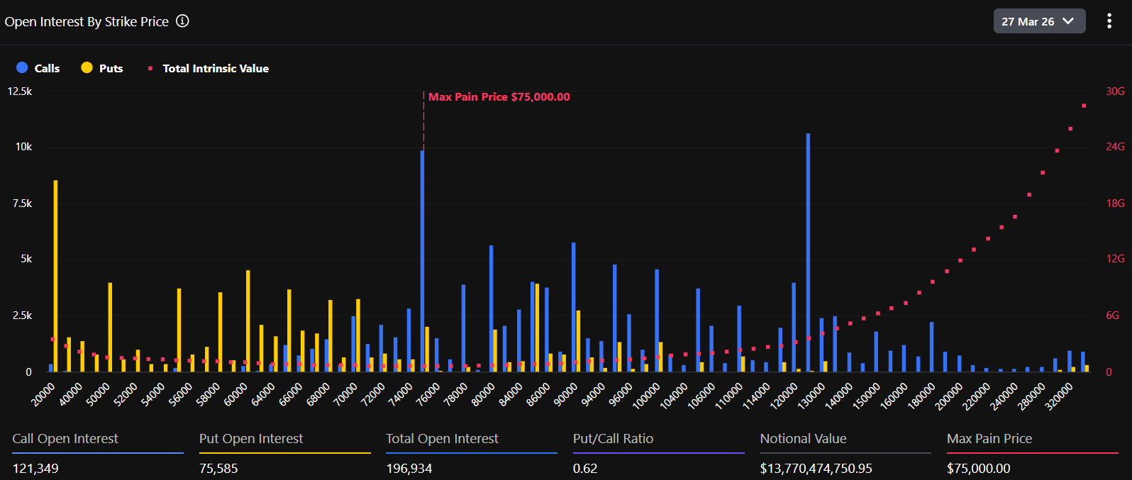 At the same time, derivative positioning quietly added pressure. Traders clustered around the $75,000 max-pain level into the expiry on the 27th of March, which kept prices pinned despite underlying demand.