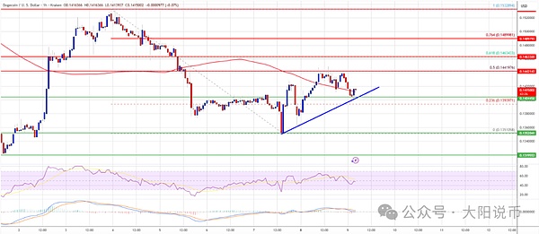 Previously, DOGE gradually recovered from the $0.1350 level, moving in line with Bitcoin and Ethereum, and successively broke through the $0.1380 and $0.140 resistance levels. The price has also moved above $0.1410 and the 100-hour simple moving average. From a technical chart perspective, an upward trend line with support at $0.1405 has formed on the hourly chart of DOGE/USD.