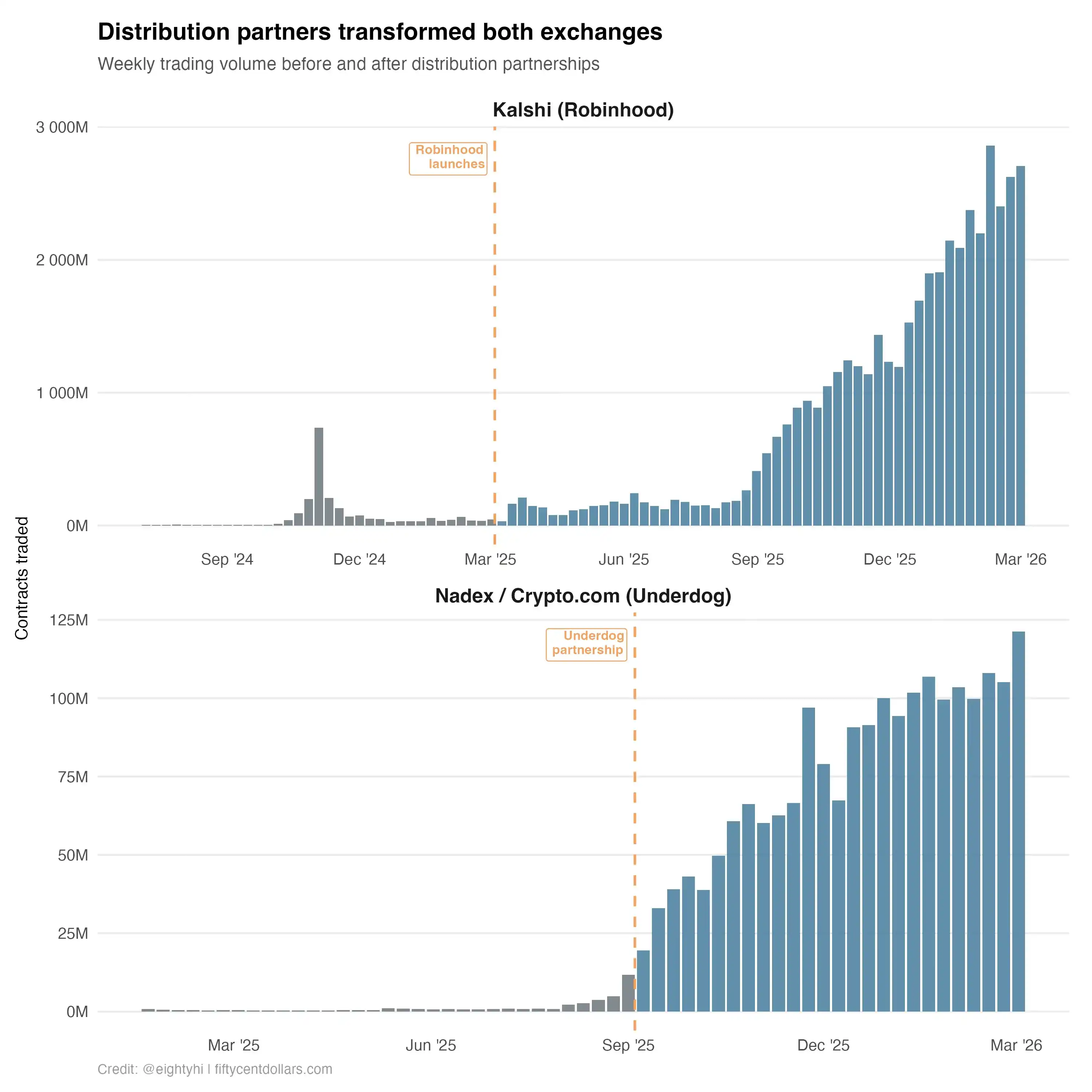 Nadex, operating as Crypto.com Derivatives, a CFTC-regulated exchange, tells a strikingly similar story. Before Underdog integrated with Crypto.com in September 2025, Nadex's trading volume was平平无奇. After Underdog介入 and began routing its users' sports bets to the exchange, weekly volume exploded by orders of magnitude. The same pattern, different names. Underdog is to Nadex what Robinhood is to Kalshi: the distribution layer that turns a quiet exchange into a busy hub.