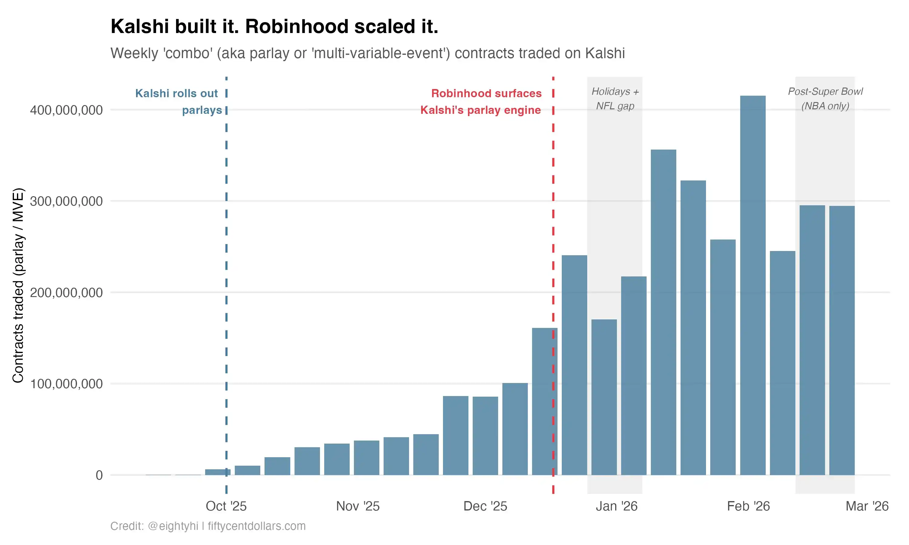ARobinhood's distribution channel dramatically amplified the trading volume of Kalshi's multi-event contracts, scaling weekly volume from around 45-60 million contracts to nearly 300 million, demonstrating the massive leverage of controlling user access.