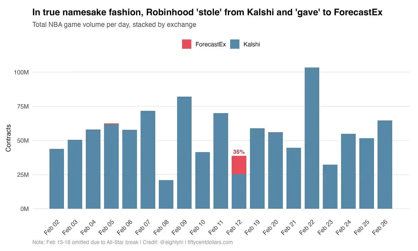 I don't think ForecastEx achieved any customer acquisition miracle overnight. It didn't improve its product, launch a marketing campaign, or deepen its order book with more liquidity. What happened was actually quite simple: Robinhood directed its massive order flow to another exchange, specifically for this night of three NBA games.