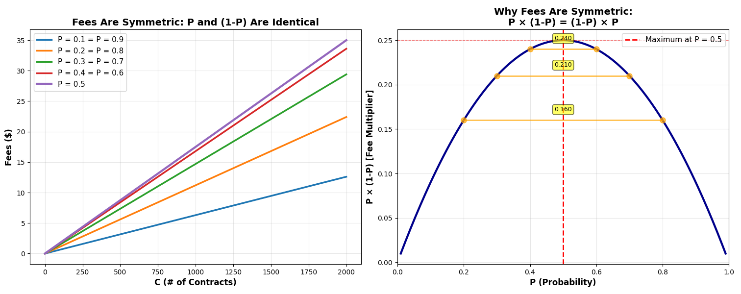 Caption: Fee vs. Implied Probability and Contract Count, right chart shows P(1-P) curve