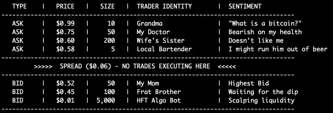 Each market has a "Yes" and a "No," each with its own order book. What is an order book? Let's get some terminology straight first...