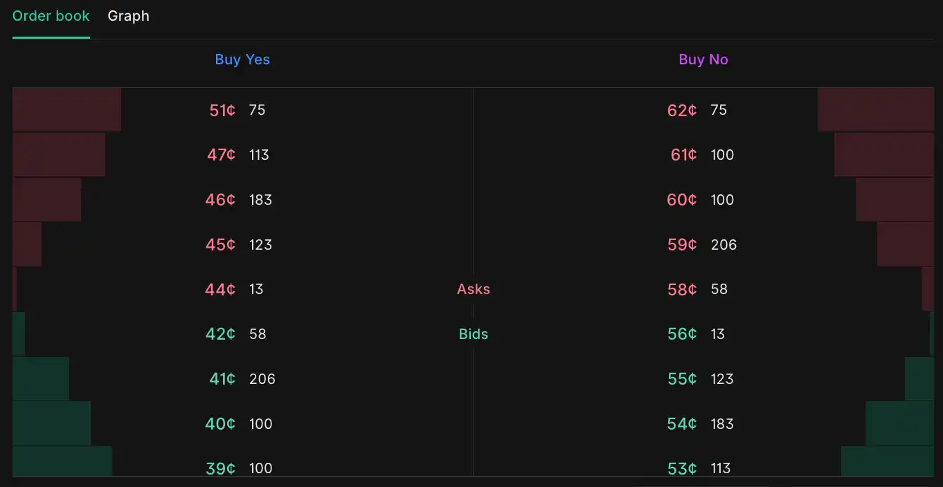 - On the "Yes" side, the lowest ask is $0.44 for 13 contracts, $0.42 can buy 58 contracts, spread $0.02.