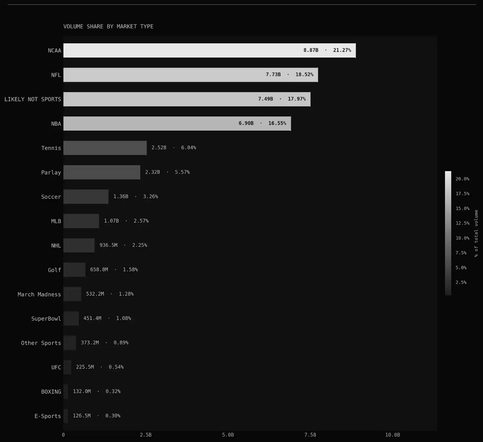 Caption: Distribution of Kalshi contract volume by category, Sports over 82%