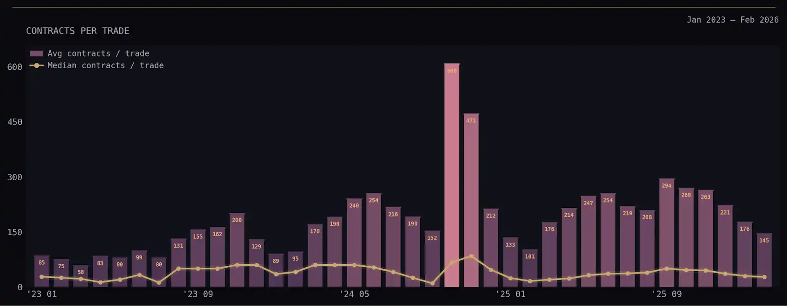 In these markets, the average number of contracts per trade is between 150-250. There was a huge spike in 2024 due to a 1 million contract order placed during the US election. The median is much lower than the average, mostly under 50 per month.