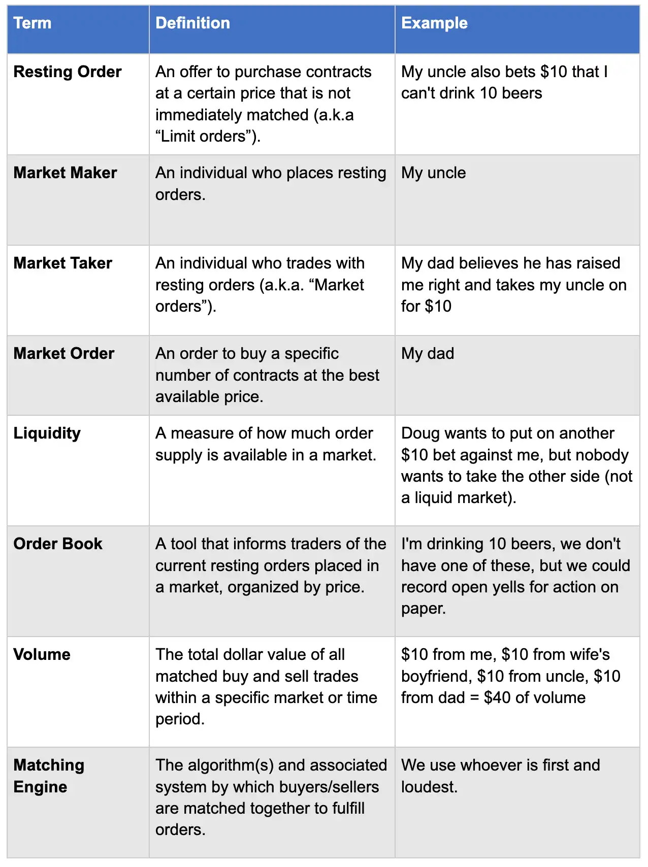 Prediction markets expand the surface area of human gambling. For example, I might bet $10 that I can drink 10 beers before midnight, and my wife's boyfriend might not believe me. I say "yes," he says "no." Replace me with LeBron James, beer with points, midnight with the end of the game, and you have a real market tradable on Kalshi.
