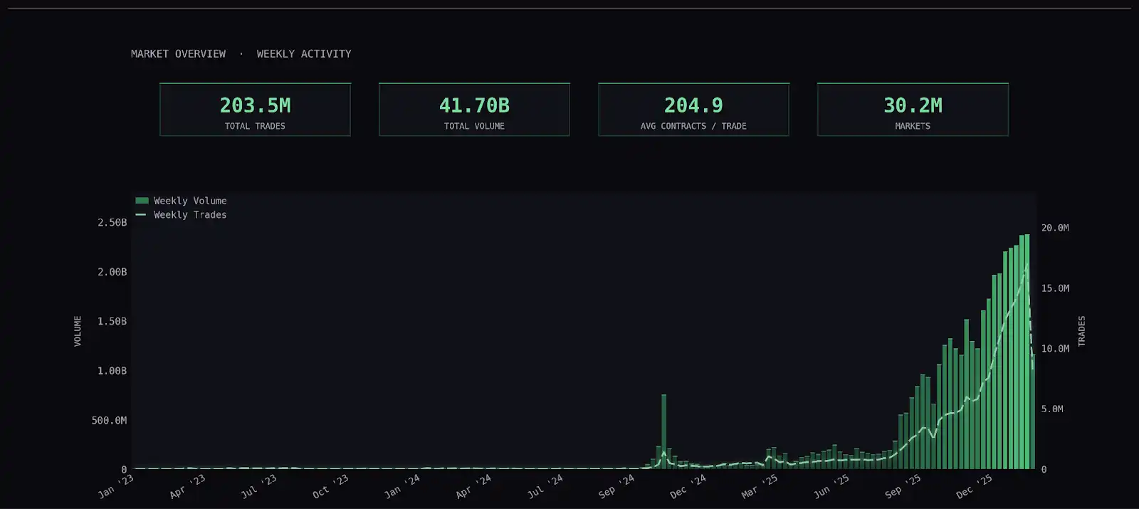I pulled historical data through Kalshi's Market API and Trading API—about 30 million markets, 203 million trades, total trading volume exceeding $41.7 billion.