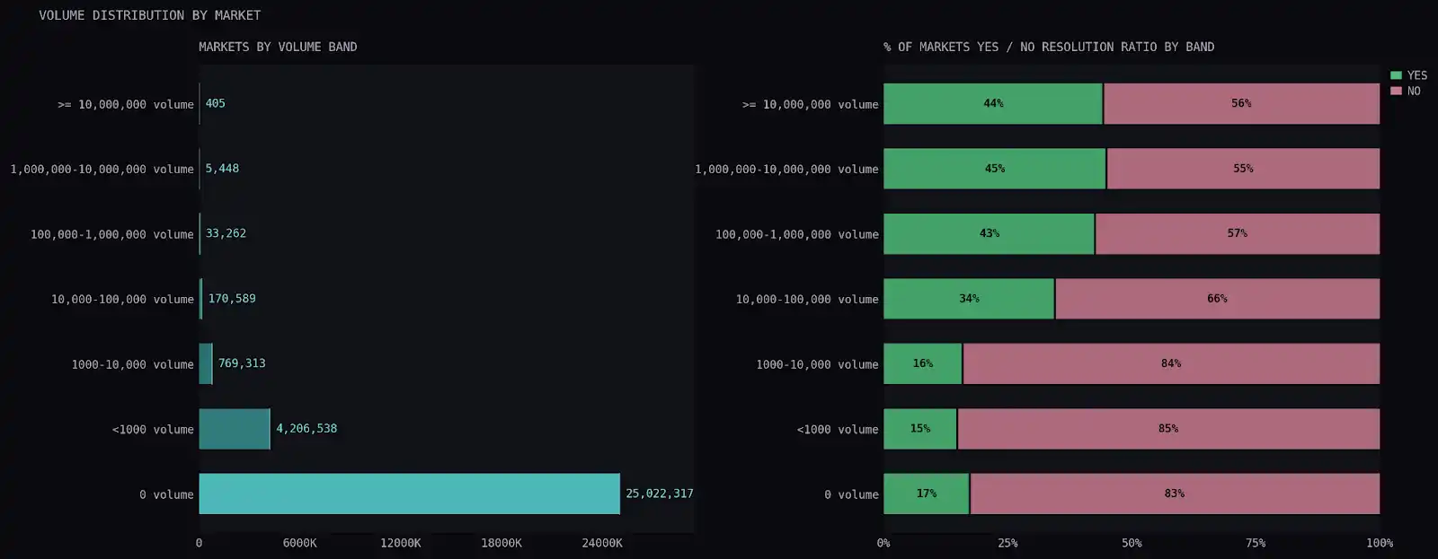 This suggests that for any given market, the base probability should be biased towards settling "No". The volume effect also makes sense—events containing many sub-markets see volume分散 across those sub-markets, with ultimately only one or a few settling "Yes".