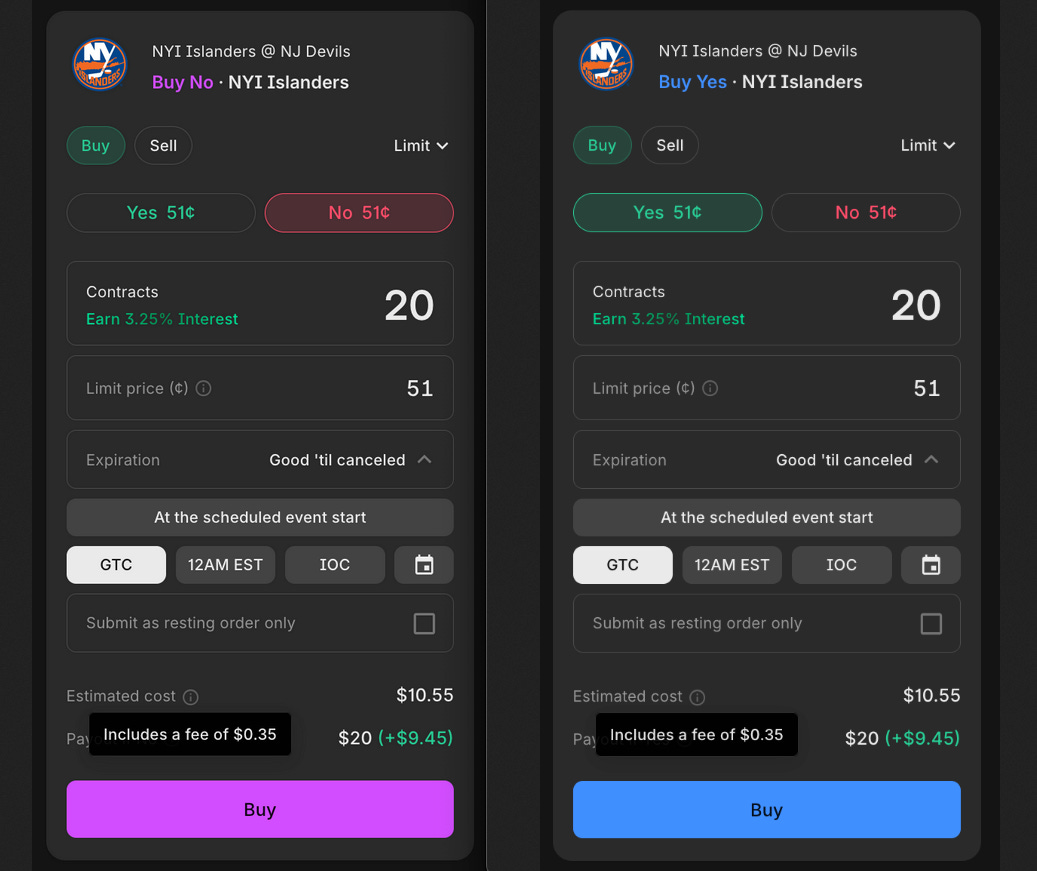 For example, an Islanders vs Devils game, which happens to be 52.4%/52.4% on the sportsbook. On Kalshi, the contract trades at $0.51 (51%). So you should trade on Kalshi, right, because 51% is better odds than the sportsbook's 52.4%?