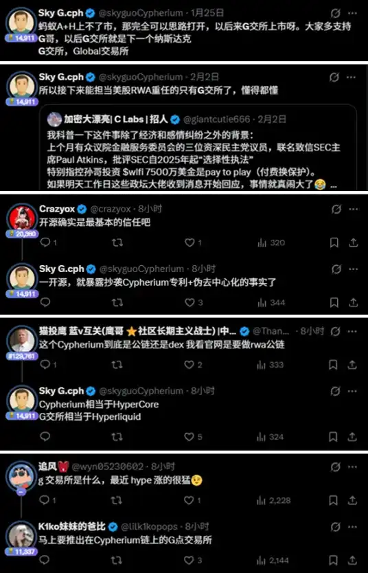 On social platforms, some KOLs expressed support for this rights protection action, but the comment sections of related posts featured疑似推广内容 (suspected promotional content) about "G-Exchange." "G-Exchange" is an upcoming new project within the Cypherium ecosystem. The coincidence in the timeline between this technical accusation and the预热 (pre-launch warm-up) of a new project makes this series of维权动作 (rights protection actions)疑似 (suspected of being) ambush marketing to generate buzz for the new business.