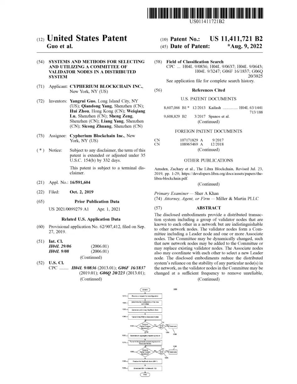 The core of this dispute revolves around a formal patent issued by the United States Patent and Trademark Office (USPTO) on August 9, 2022, with the number US 11,411,721 B2. The assignee of this patent is Cypherium Blockchain Inc., and its title is "Systems and methods for selecting and utilizing a committee of validator nodes in a distributed system."