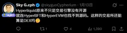 Prior to this infringement allegation, Sky Guo's criticism of Hyperliquid primarily focused on code transparency.