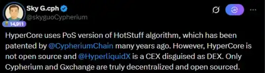 However, as Hyperliquid expands its business, it has encountered allegations of technological infringement from a peer. On February 2, Sky Guo, founder of the RWA public chain project Cypherium, publicly accused Hyperliquid of infringing on its patented technology on social media. Sky Guo claimed that Hyperliquid's underlying consensus engine, HyperCore, uses a patented optimized version of the PoS-based HotStuff algorithm and demanded that Hyperliquid cease the infringement.