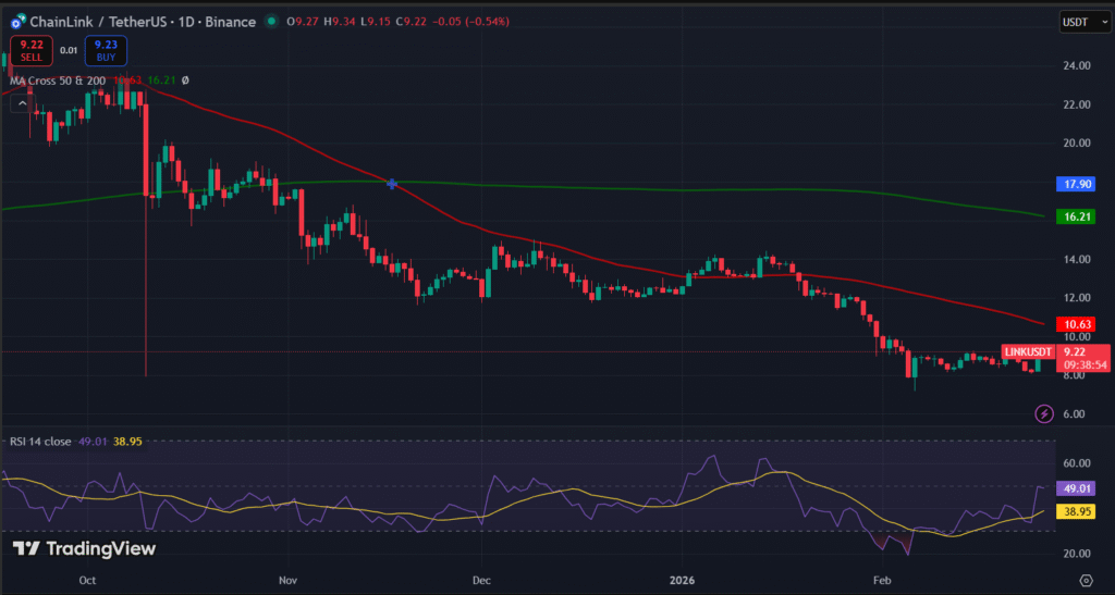 Major altcoins followed Bitcoin’s move, posting notable gains as overall market sentiment shifted away from extreme fear levels. At the time of writing, LINK is priced at $9.25 with a market cap of $6.5 billion. Still, the token’s price action continues to reflect consolidation below key moving averages.