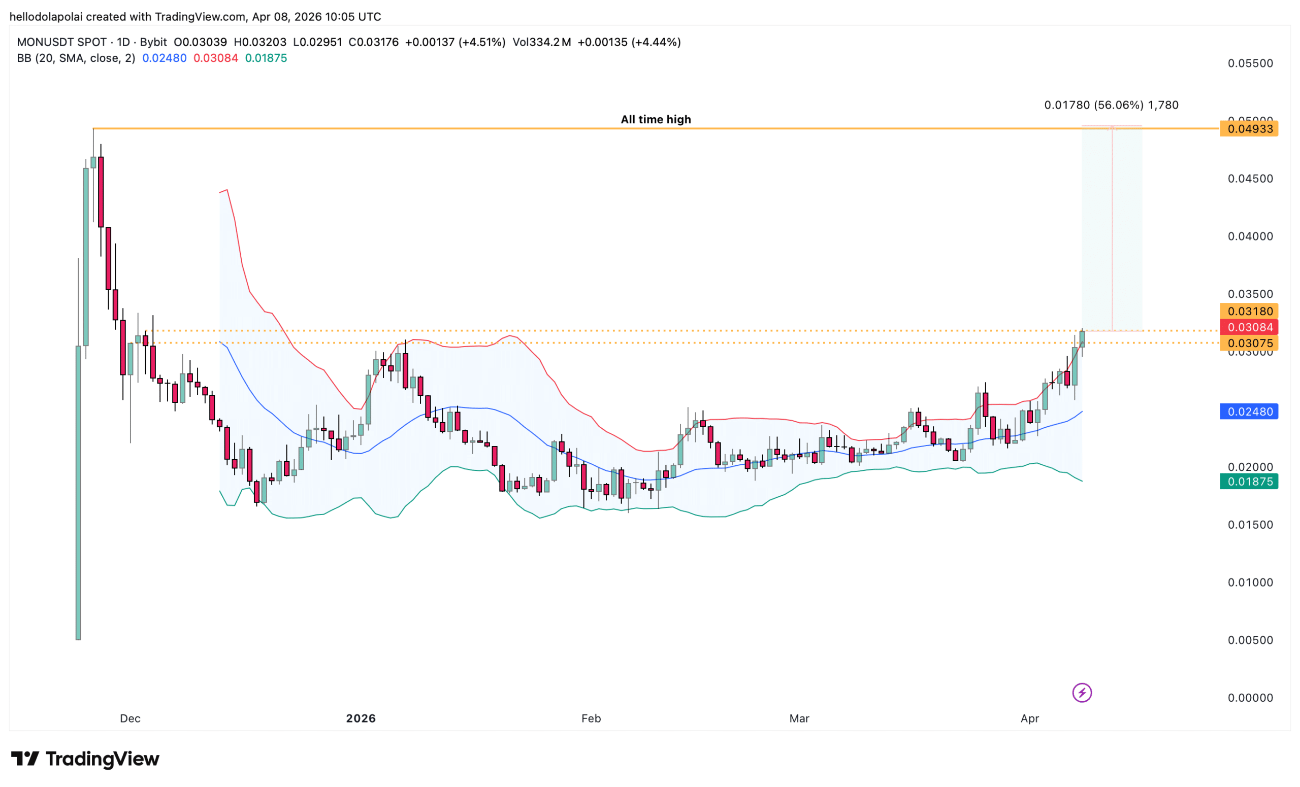 Bullish positioning comes with caution. The Bollinger Bands indicator, which measures whether an asset is overbought or oversold, shows that MON has entered the overbought region.