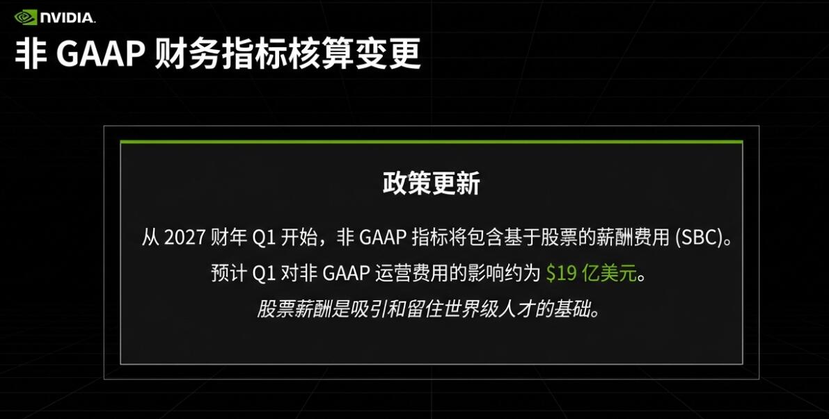 Simultaneously with the earnings release, Nvidia announced that starting from Q1, financial metrics on a non-GAAP basis will no longer exclude stock-based compensation (SBC). Due to this adjustment, Nvidia预计that non-GAAP operating expenses in Q1 will be impacted by approximately $1.9 billion.