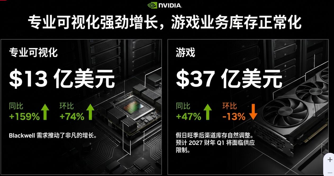 Professional visualization also achieved more than double year-over-year revenue growth and 74% sequential growth under Blackwell's impetus, becoming one of the brightest incremental businesses besides data centers. However, the scale of this business is far smaller than data centers.
