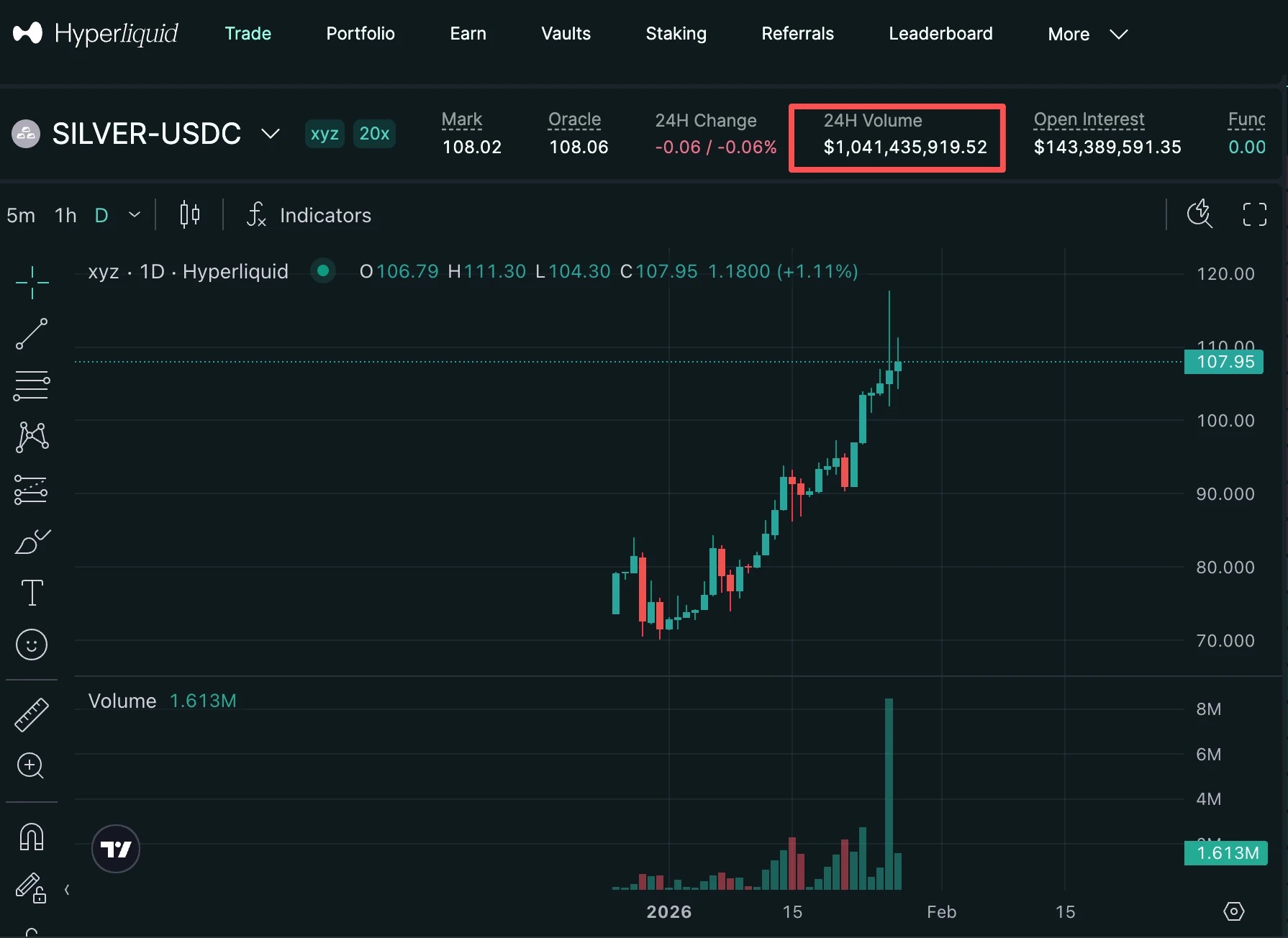 AHyperliquid offers a silver/USDC perpetual contract with a 24-hour trading volume exceeding $1 billion.
