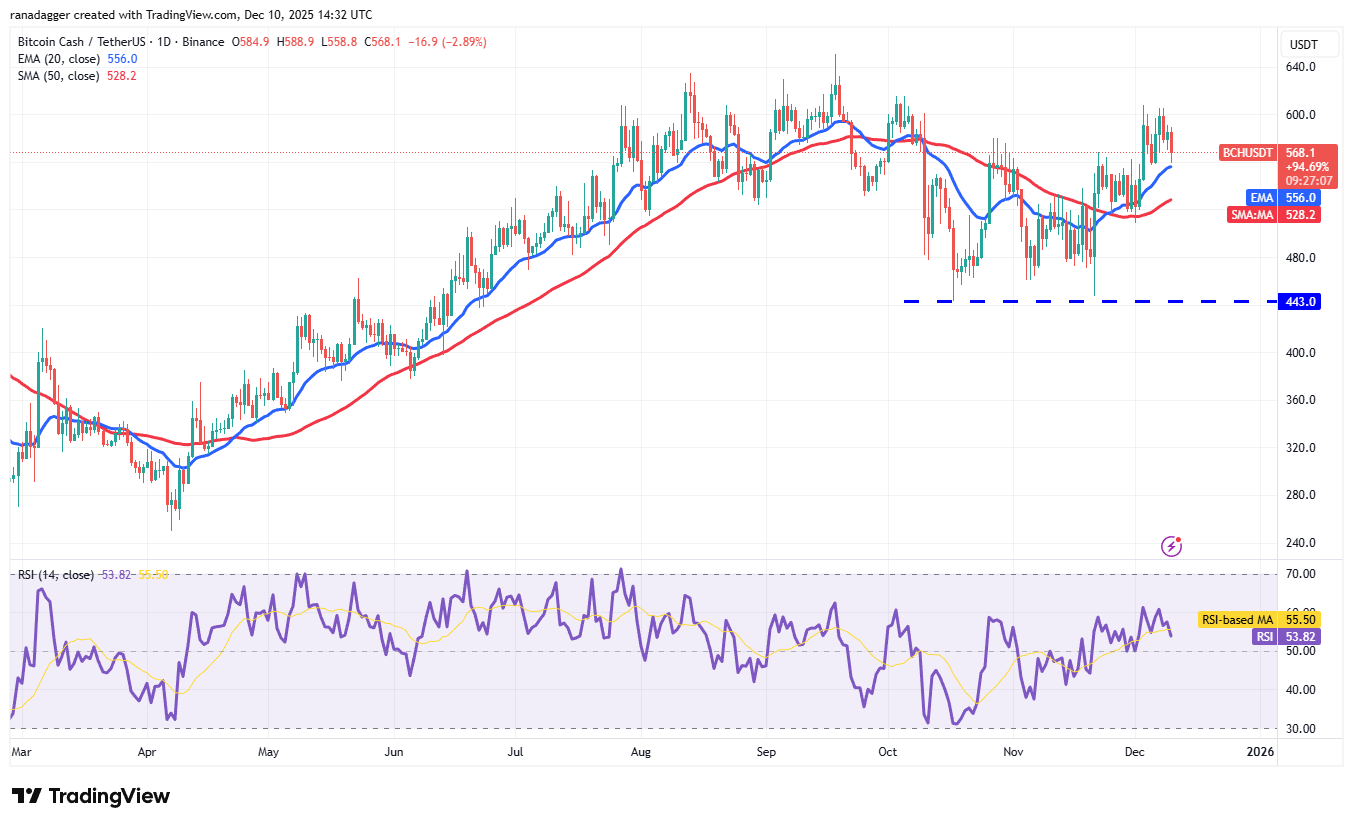 The bears are attempting to pull the Bitcoin Cash price below the 20-day EMA ($556). If they manage to do that, the BCH/USDT pair could slide to the 50-day SMA ($528) and then to $508.