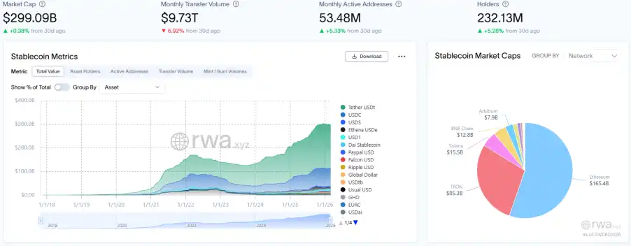 This week, the total on-chain market capitalization of RWA grew steadily to $26.52 billion, while the total market cap of stablecoins continued to rise for two consecutive months to $299.09 billion. The number of monthly active addresses continued to recover, indicating that the market is entering a phase of steady expansion and improving user activity.