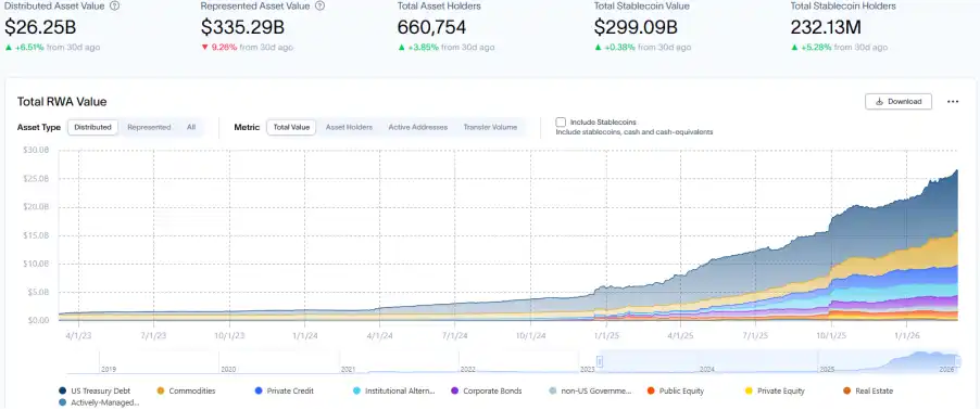According to the latest data from RWA.xyz, as of March 6, 2026, the total on-chain market capitalization of RWA reached $26.52 billion, an increase of 6.51% compared to the previous month. The total number of asset holders reached approximately 660,800, an increase of 4.35% compared to the previous month, slightly lower than the growth rate of asset size, indicating that the incremental funds are mainly allocated by institutions or large investors.