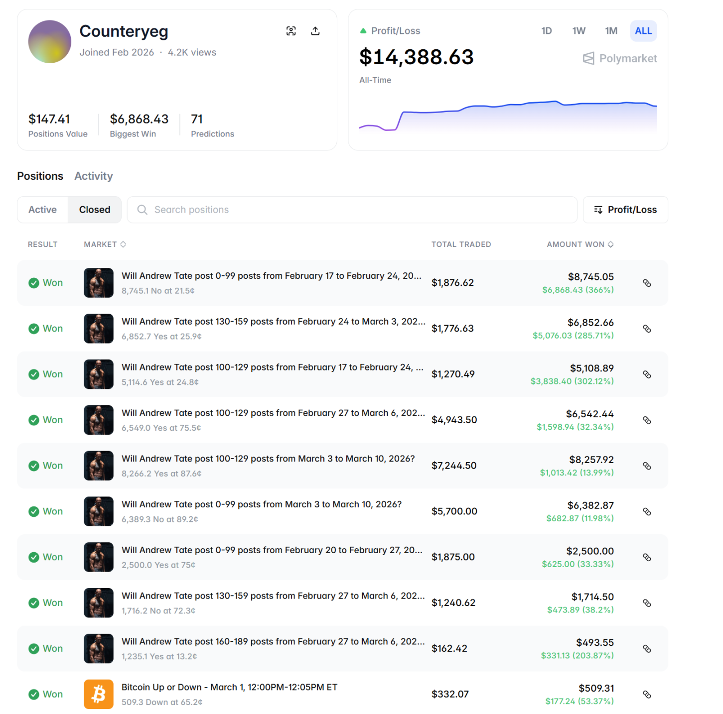 On March 10, X user @Euanker posted an exposé alleging that renowned combat sports champion Andrew Tate was involved in insider trading on Polymarket, profiting by manipulating markets related to the quantity of his personal tweets. Euanker pointed out that Tate created and controlled at least 7 Polymarket accounts, accumulating profits of $52,286 across six 'Weekly Tweet Count Prediction' markets. These markets essentially depend on Tate's own actions, with the exposé bluntly stating his aim was to 'raise funds for a rented Bugatti sports car.'