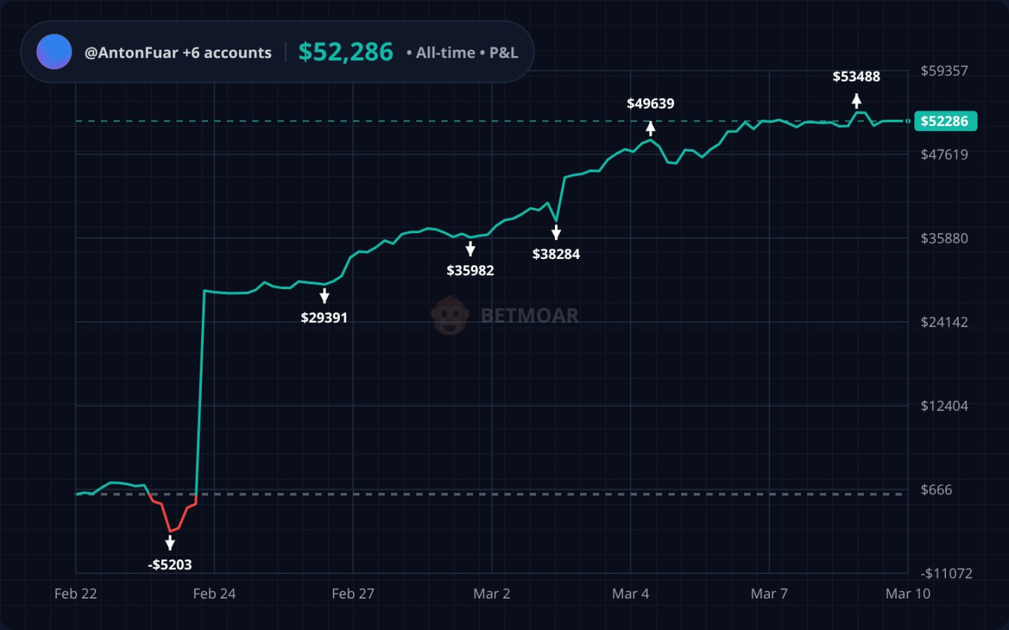The fund flow chart attached by Euanker clearly marks the Polymarket icon and the Gnosis Safe endpoint. A profit chart of the 7 accounts further corroborates, showing a rapid climb from an initial loss of $5,203 on February 22 to a cumulative peak of $52,286 on March 10, with multiple instances synchronized with Tate's public tweet timings. This level of consistency far exceeds coincidence. The identical combination of exchanges, same USDC bridging scale, and operational patterns precisely matching market settlement times constitute the core on-chain basis for the exposé's insider trading allegations.