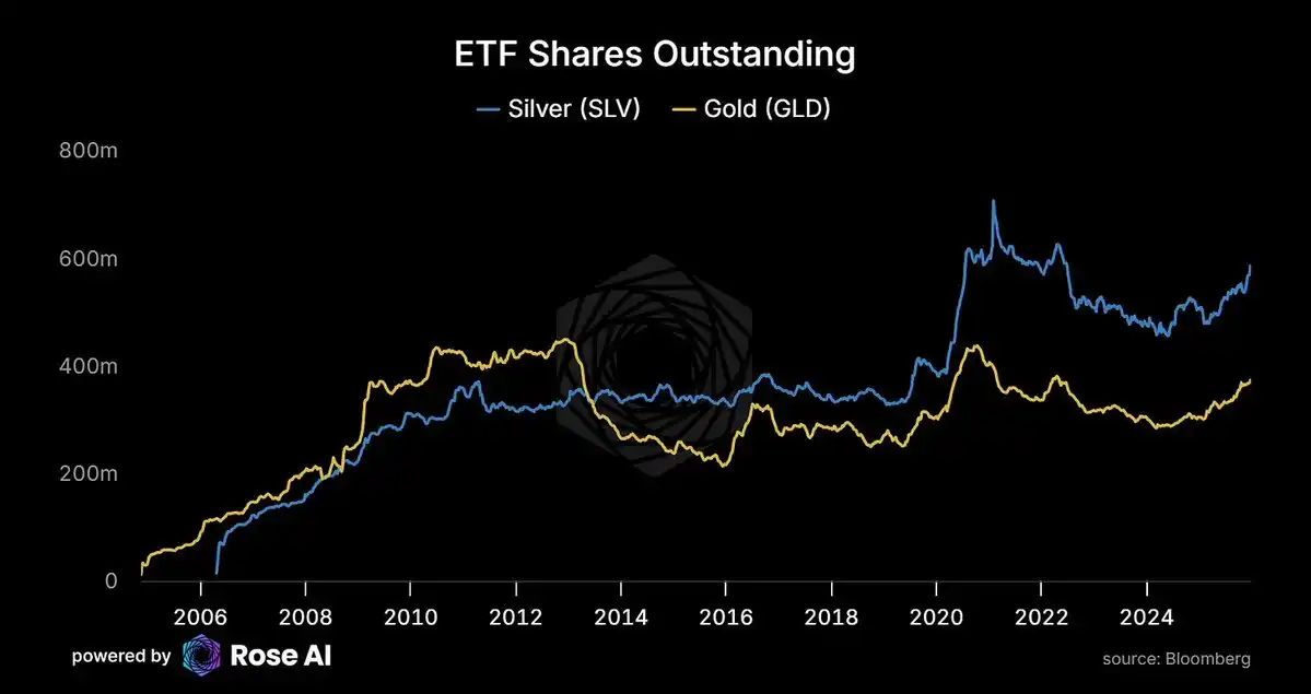 The number of shares outstanding for the SLV ETF is rising again after years of outflows. As prices increase, demand is also increasing.