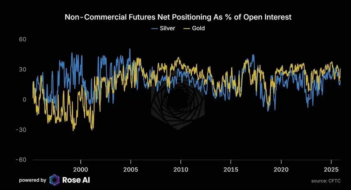 Currently, speculative net long positions in gold account for 31% of total open interest, while in silver, this figure is only 19%. This indicates that, despite the price increase, speculative positioning is not at extreme levels, and there is still room for further upside.