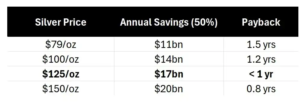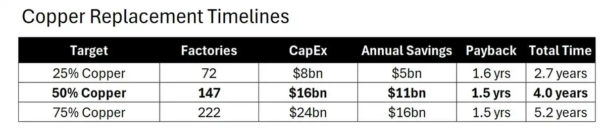 When silver reaches $125/oz, the payback period for copper substitution shortens to less than a year. At that point, every board meeting will likely revolve around copper substitution. However, even if all companies decide tomorrow, it will still take 4 years to achieve 50% copper substitution. Meanwhile, $125/oz is still 50% above the current spot price.