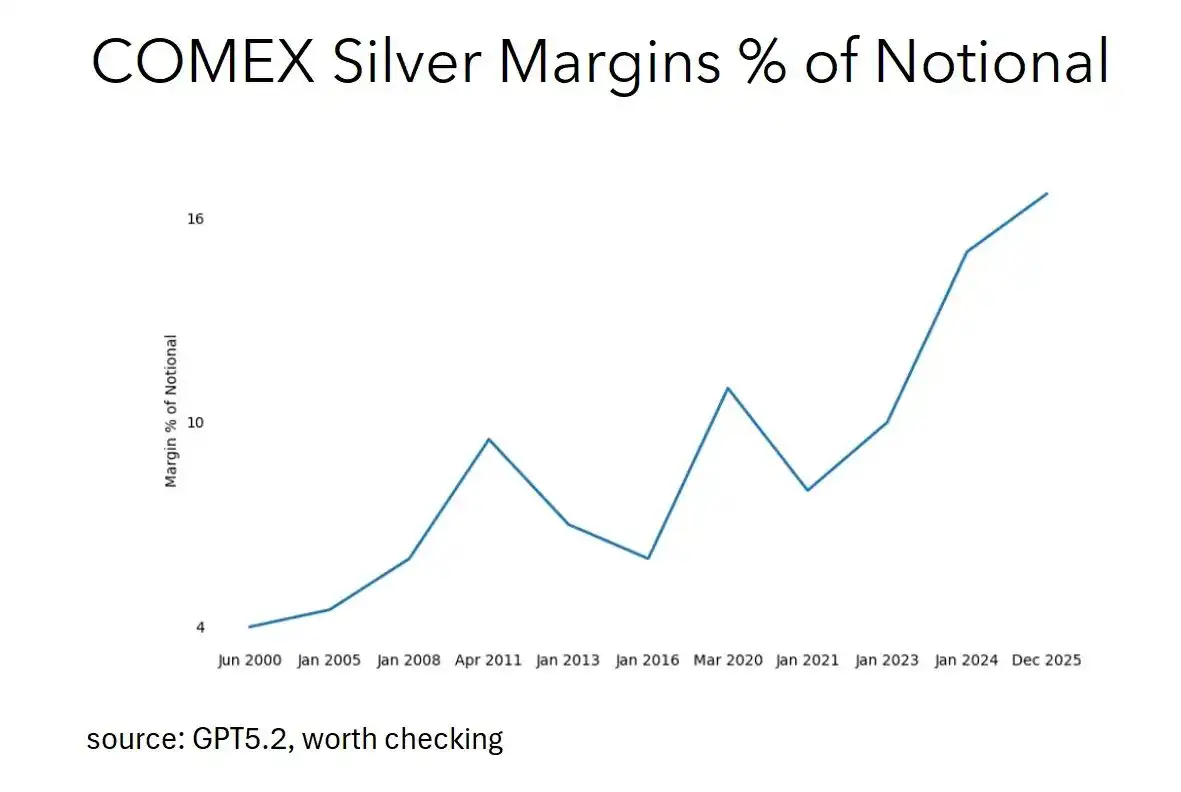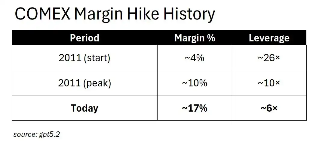 Looking back at 2011, the margin for silver started at about 4% of the notional value, meaning that with just $4 of capital, you could control $100 worth of silver—a 25x leverage, which was extremely risky. Then, the CME raised the margin to about 10% within a few weeks, reducing leverage from 25x to 10x. The chain reaction of forced liquidations directly killed that silver rally.
