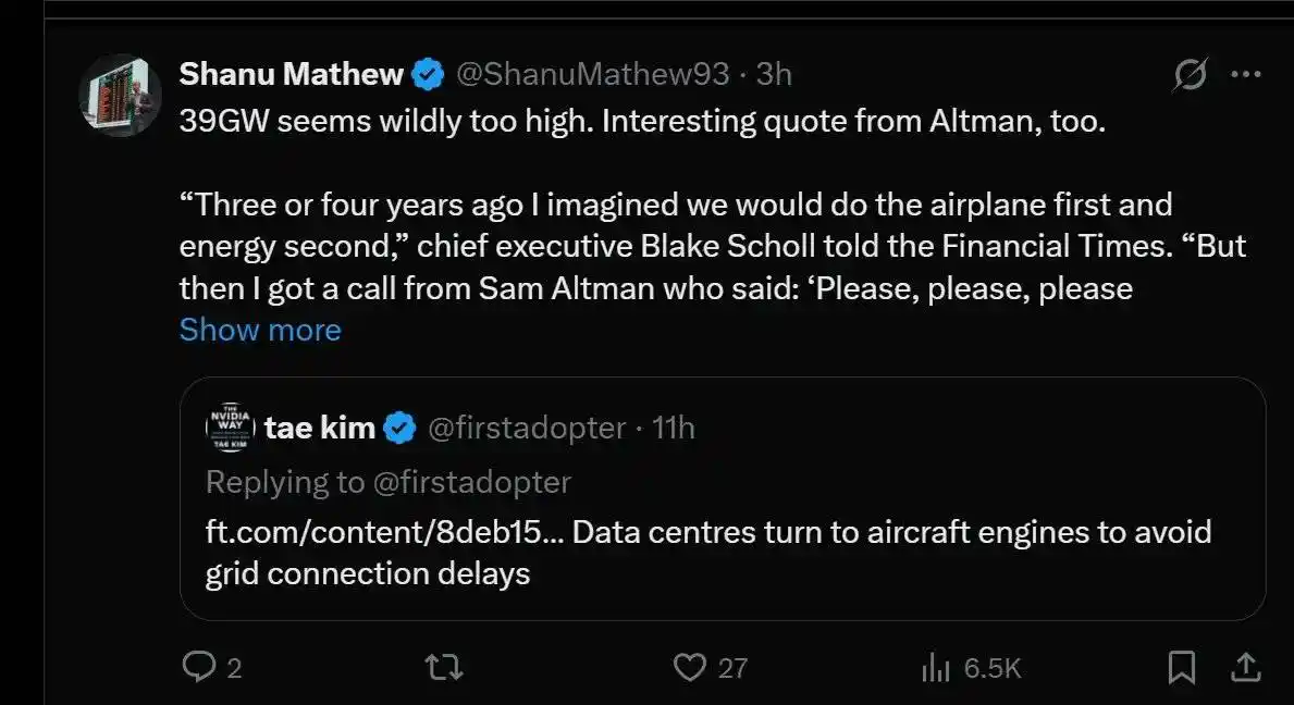 Sam Altman (OpenAI CEO) is reaching out to companies everywhere, desperately seeking power supply;