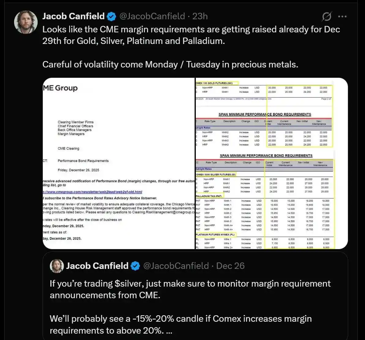 The CME (Chicago Mercantile Exchange) announced an increase in margin requirements for precious metals, effective December 29th.