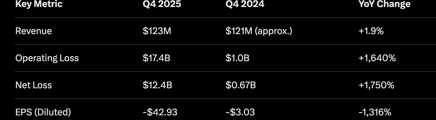 - Q4 2025 posted an operating loss of $17.4 billion and a net loss of $12.6 billion.