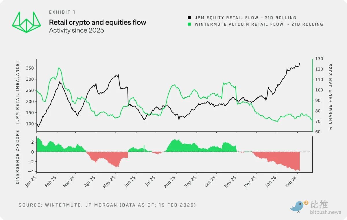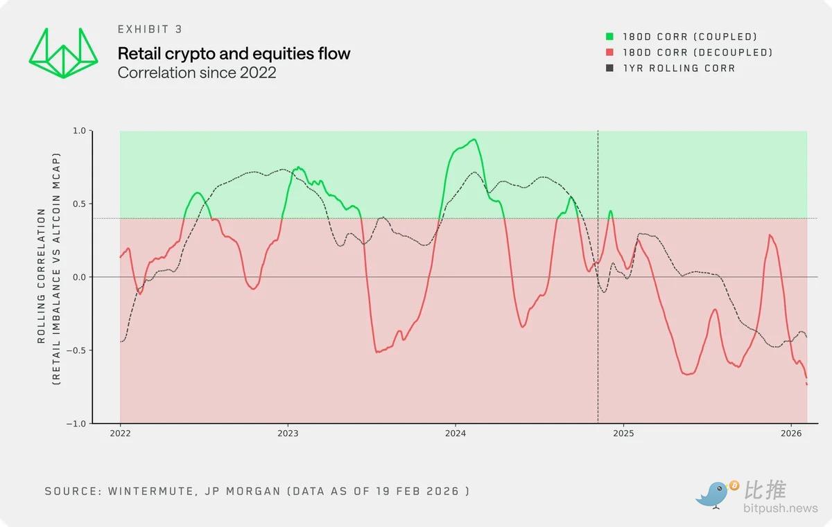 As a leading market maker in the crypto industry, Wintermute handles daily trading volumes amounting to hundreds of billions of dollars. Compared to ordinary researchers, they can penetrate the fog and see the most authentic flow of retail funds. In this latest report, Wintermute raises an alarming point for the crypto circle: the "retail faith" that once supported the crypto market is wavering. In the past, cryptocurrencies and stocks typically rose and fell together, but starting from late 2024, this relationship completely reversed—retail investors began making a "choose one" single choice between the two.