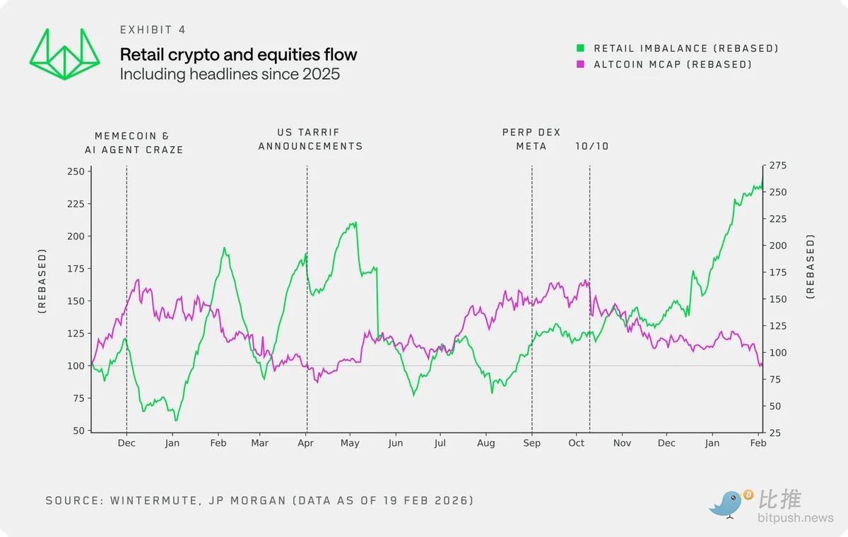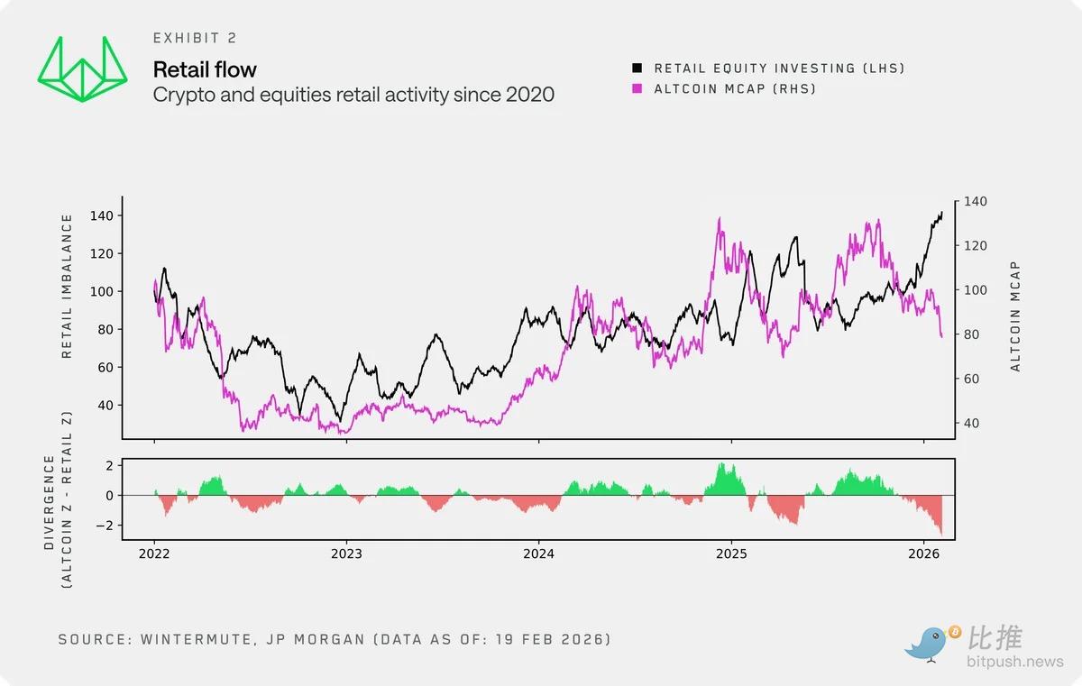 Retail activity drives the cryptocurrency market. Through speculation, reflexive buying on dips, and agile capital rotation within the token world, retail investors define every major market cycle. However, new data indicates that the relationship between retail investors and cryptocurrencies is changing. For some time, we have observed that the stock market is attracting retail attention at the expense of altcoins. New data from J.P. Morgan's strategy department, combined with our own flow data, now suggests that stocks and cryptocurrencies are increasingly becoming complementary risk assets.