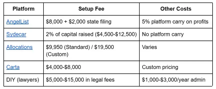 Platform fees (AngelList's $8,000 + 5% carry) are stacked on top of the lead's 20% carry.