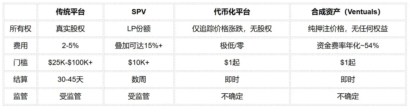 Tokenization platforms offer instant, low-cost access, but the ownership claim is weaker, and regulatory uncertainty is real. Synthetic assets like Ventuals give you price exposure, but funding rates make long-term holding prohibitively expensive.