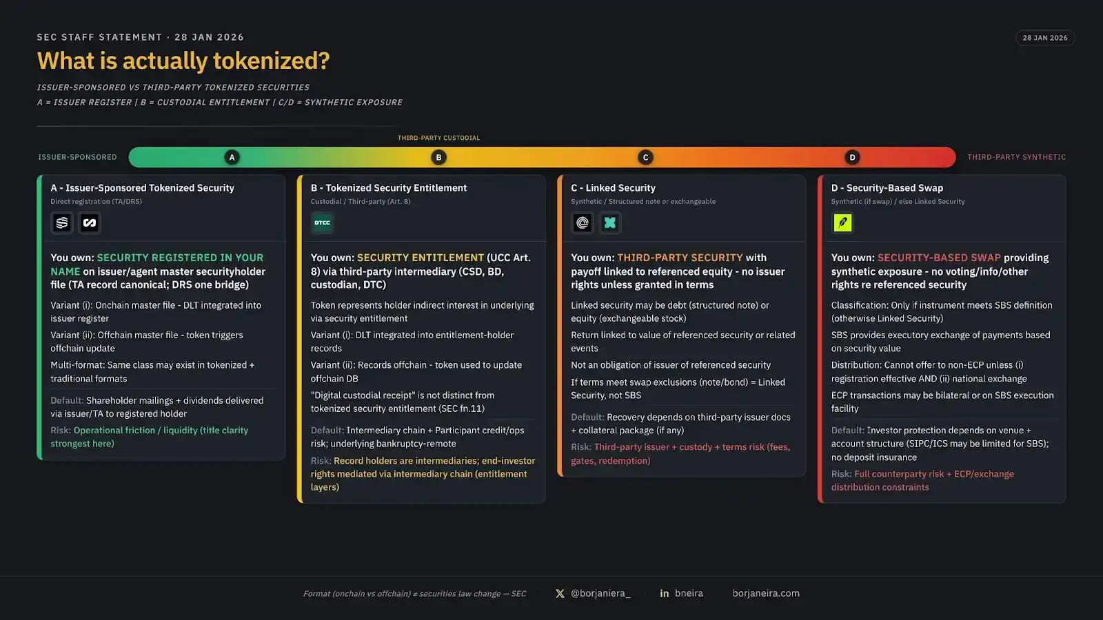 The SEC's statement in January 2026 not only reiterated that "tokenized securities are still securities" but also established a precise classification of how tokenization actually works. Researcher Borja Neira (@borjaneira_) created one of the clearest visualizations of this framework, showing the evolution from issuer-sponsored to third-party synthetic models.