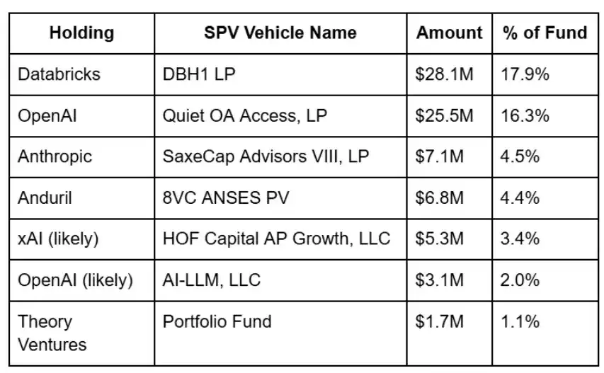 As documented by AccessIPOs, the fund's holdings read like a who's who of late-stage AI projects: Databricks ($28M, via DBH1 LP), OpenAI ($25.5M, via Quiet OA Access, LP), Service Titan ($21.3M), dbt Labs ($15M), Anthropic ($7M, via SaxeCap Advisors VIII, LP), Anduril ($6.8M, via 8VC ANSES PV), Canva ($6.2M).